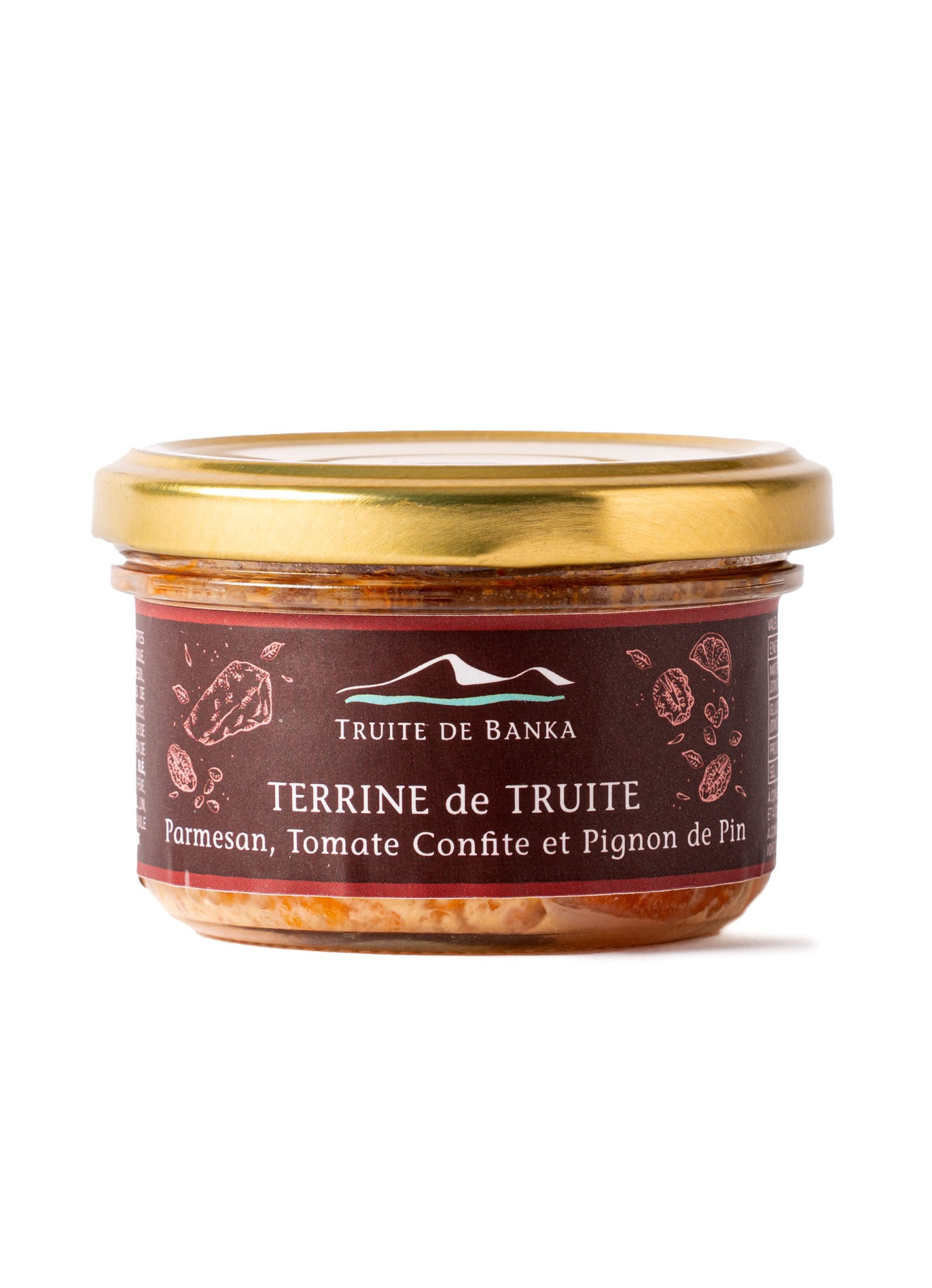 Terrine de truite parmesan, tomate confite et pignon de pin